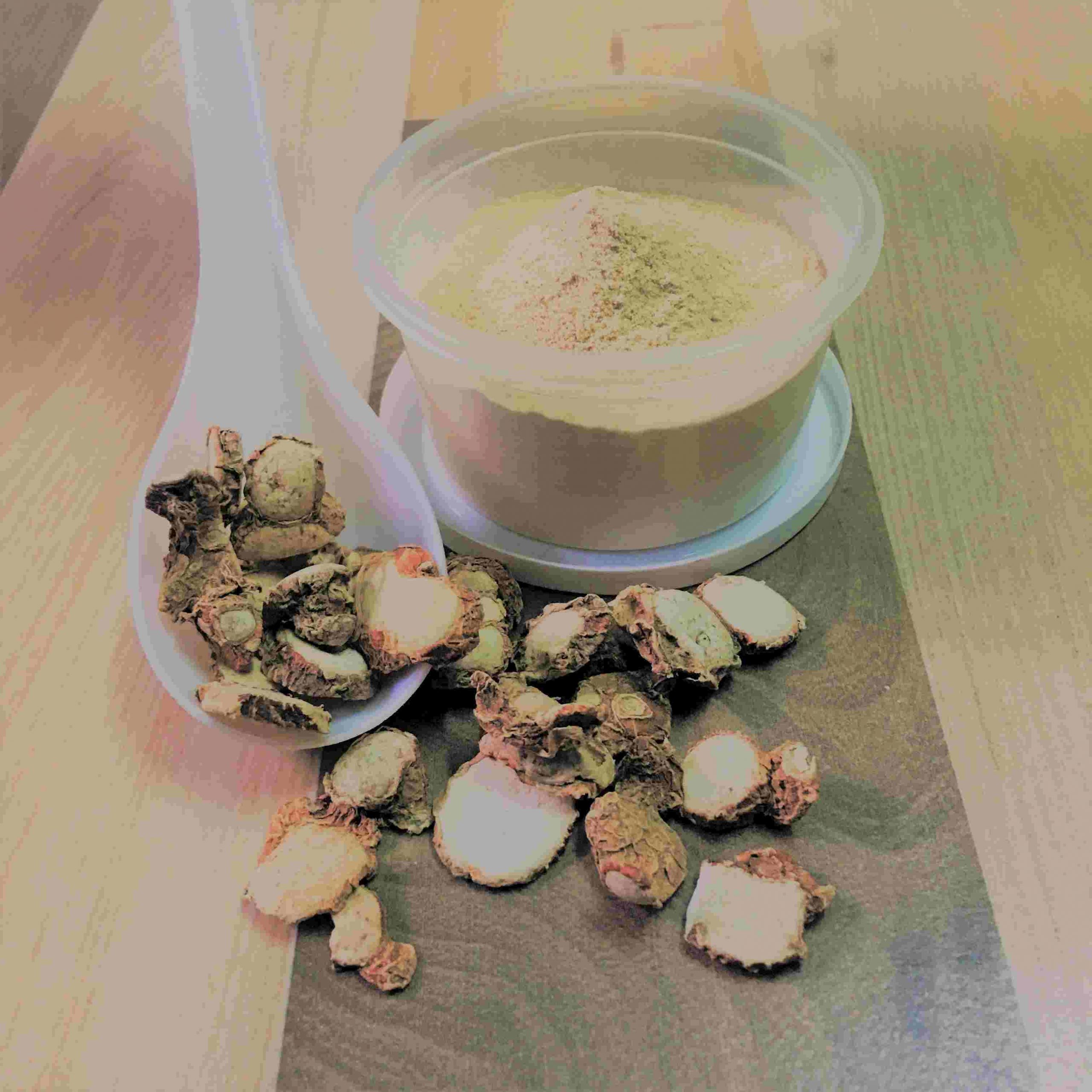 • The rhizomes are powdered and used as an antiseptic agent and as a poultice for various aches and pains.